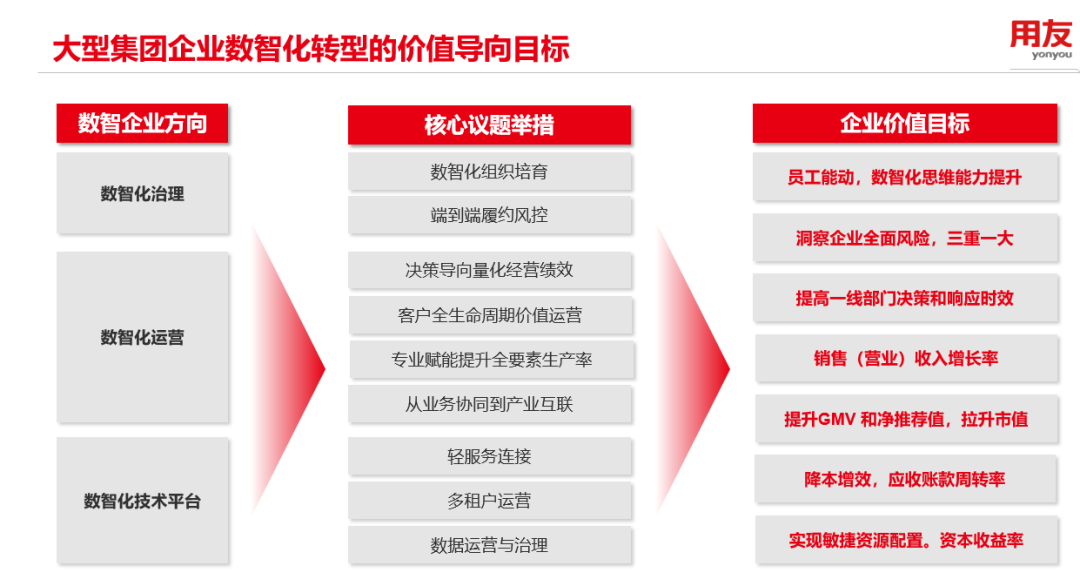 用友認(rèn)為,大型企業(yè)在需求重塑、產(chǎn)業(yè)調(diào)整、政策升級(jí)等多重變革力量交織下,數(shù)智化轉(zhuǎn)型難度與日俱增。對(duì)于這項(xiàng)復(fù)雜而漫長(zhǎng)的工作來(lái)說(shuō),明確價(jià)值導(dǎo)向?qū)⒅破髽I(yè)拾級(jí)而上。